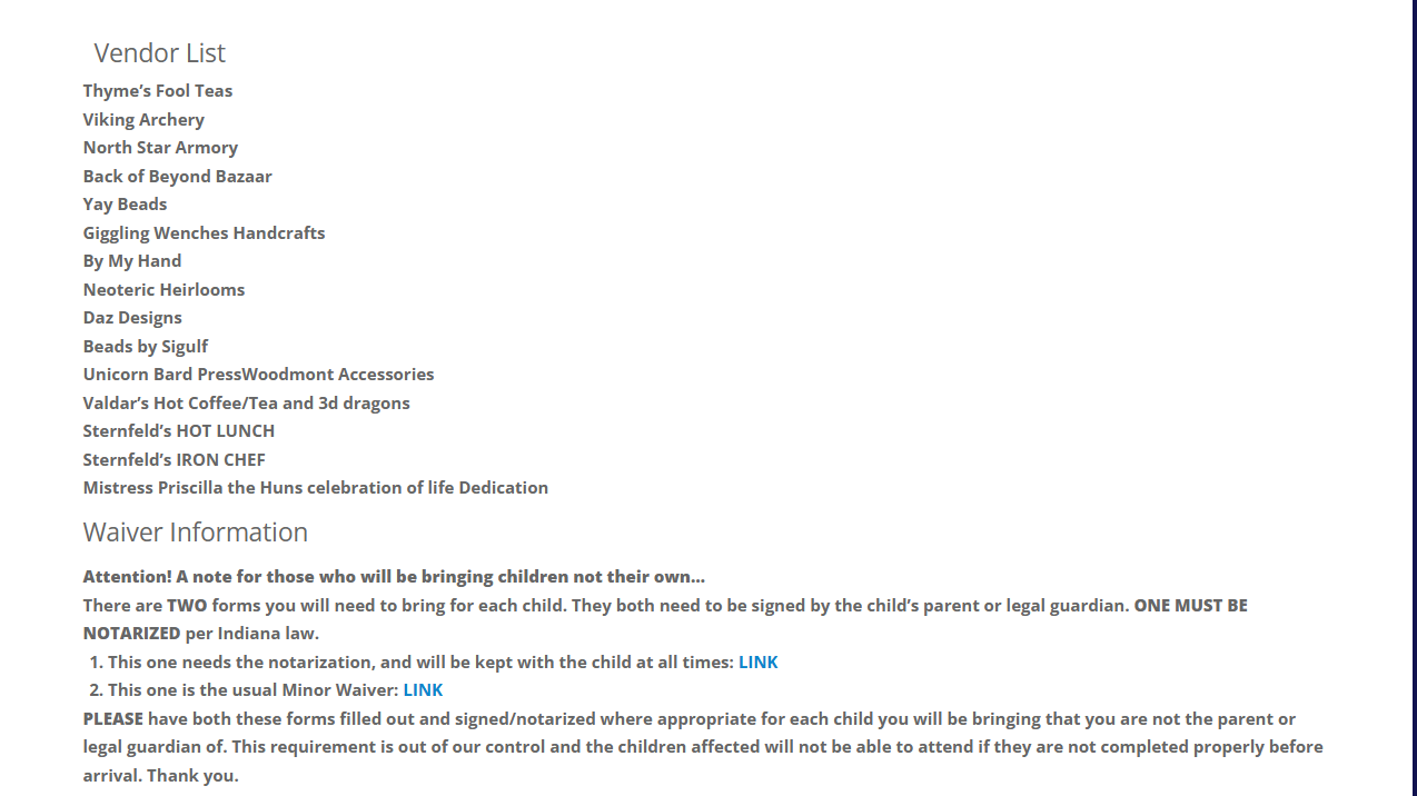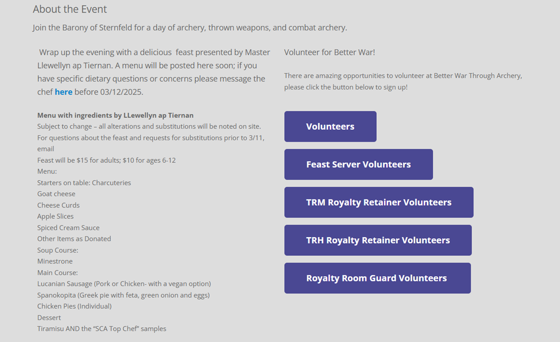 This is the “About the Event” section, which includes general information as well as registration and volunteer information. The SCA is a nonprofit that relies heavily on volunteers to make events happen.