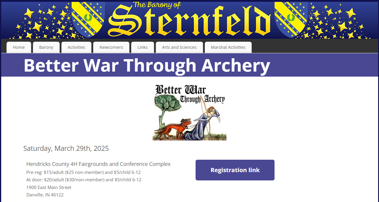 Following are screenshots from the Better War through Archery 2025 website I created for the Barony of Sternfeld for the Society for Creative Anachronism (SCA), a pre-17th century historical reenactment group located in Indianapolis, Indiana.