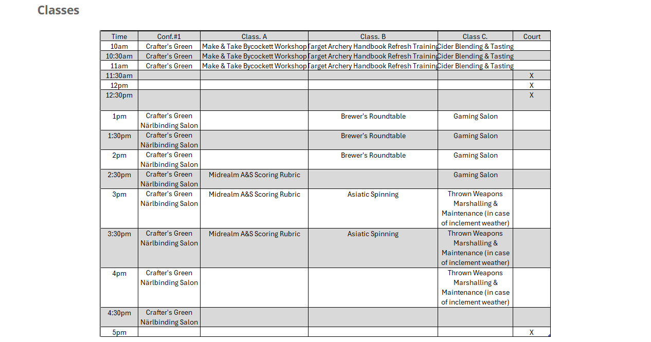This section included the information needed to register for the event and the day’s general schedule. This was the style for Elementor, a theme the Barony is moving away from using. I, as the current webminister, am spearheading that project as of this posting.